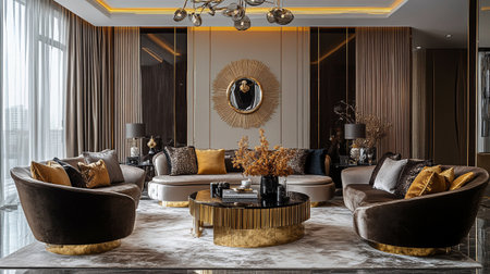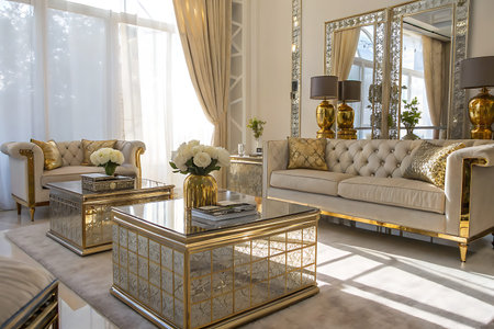 Bright and elegant living room featuring stylish furniture, gold accents, and reflective surfaces, creating a cozy and luxurious atmosphere perfect for relaxation and entertaining.