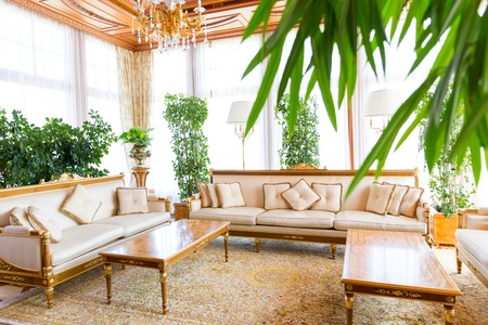 Luxury hotel lobby interior with sofas and armchairs