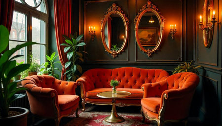 Luxurious living room showcasing vintage orange velvet furniture set