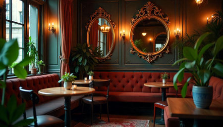 Elegant upscale restaurant interior with ornate mirrors and plants