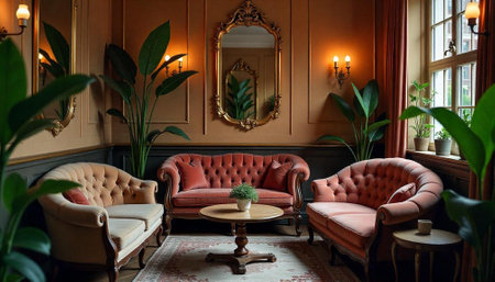 Elegant sitting room with vintage furniture and plant decorations