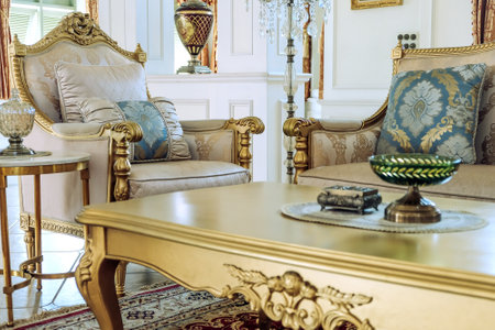 very rich interior of the apartment with golden decorations on the walls in the Baroque style and luxury furniture with gold paint.