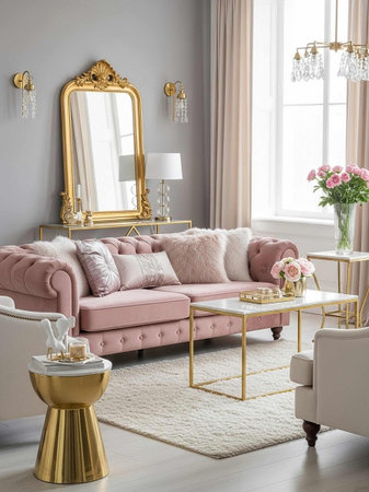 Luxury living room with pink sofa and golden mirror in classic style