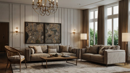 Luxury living room interior design with beige sofa and coffee table
