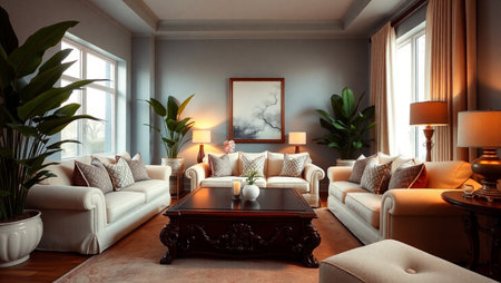 Luxury living room interior design in classic style with beige sofas and pillows