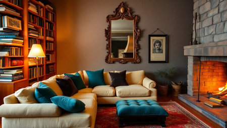 Cozy living room interior with fireplace, bookshelves and sofa
