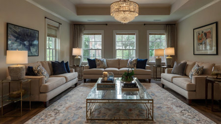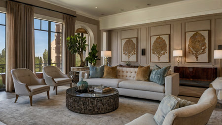 Luxury living room with beige sofas and coffee table