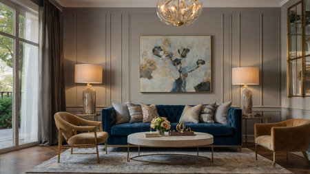 Elegant living room interior with blue walls and luxury accents
