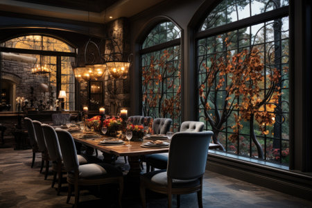 Elegant dining room with candlelit table setting and floral centerpiece. That the image is generated using AI.