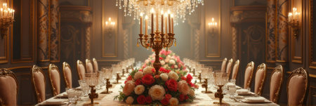 Elegant candlelit banquet hall with roses and crystal chandelier. That the image is generated using AI