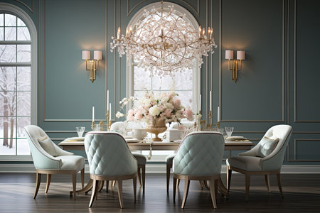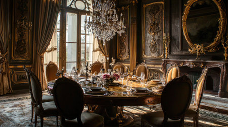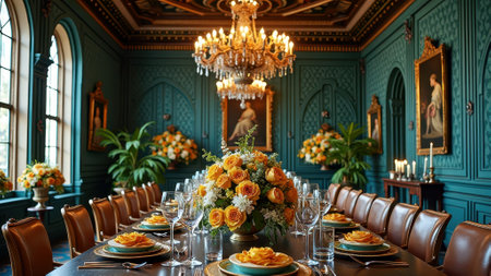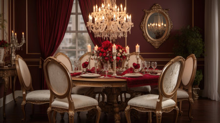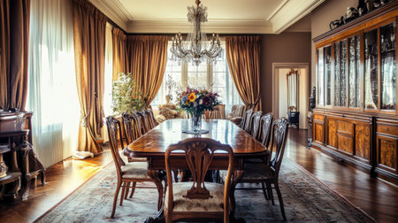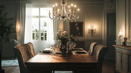 Elegant vintage dining room with chandelier and floral centerpiece. That the image is generated using AI.
