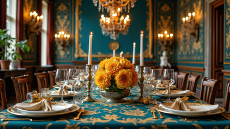 A grand dining table set for a banquet in a royal palace, complete with chandeliers and gold cutlery.