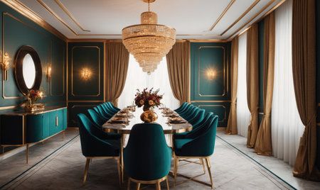 Interior design inspiration of Art Deco Glam style home dining room loveliness decorated with Glass and Velvet material and Mirrored Accents .Generative AI home interior design .
