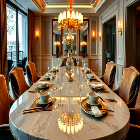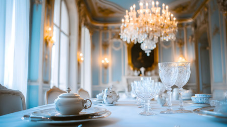 An elegant dining room featuring a long ornately carved table set with delicate china and crystal glasses. The soft glow from the chandelier casts a warm ambiance over the timeles