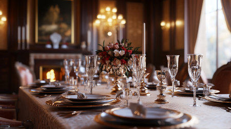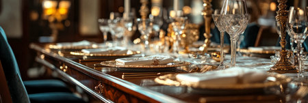A luxurious vintage dining setting for a special event, with embroidered napkins, gold-rimmed china, polished silverware, and velvet chairs, creating a refined and elegant ambiance, banner