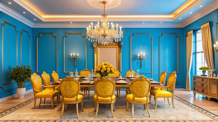 A luxurious dining room with teal walls, gold accents, and a large crystal chandelier