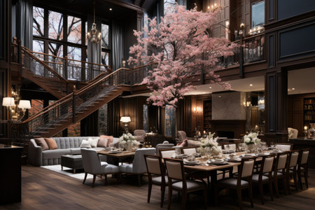 Elegant dining room with floral centerpiece and candlelit ambiance. That the image is generated using AI.