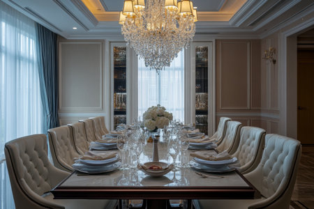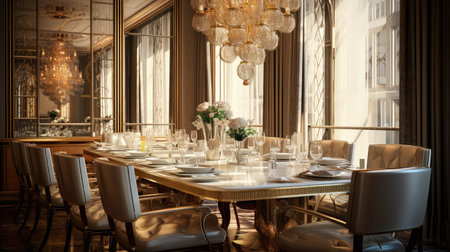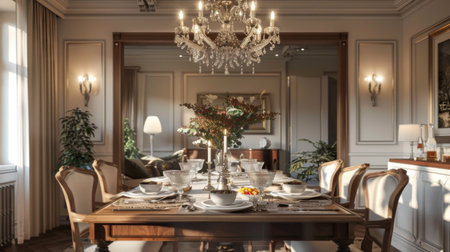 Elegant dining room with chandelier and formal table setting. That the image is generated using AI.