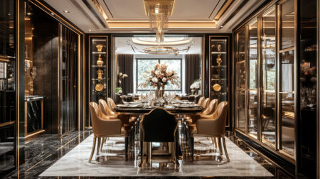 Interior design inspiration of Art Deco Glamorous style home dining room loveliness decorated with Marble and Brass material and Chandelier .Generative AI home interior design .