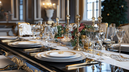 This stunning image showcases an elegant dining table set with exquisite china and beautiful floral arrangements. The luxurious golden accents enhance the sophisticated ambiance, creating a perfect setting for a gourmet meal or celebration.