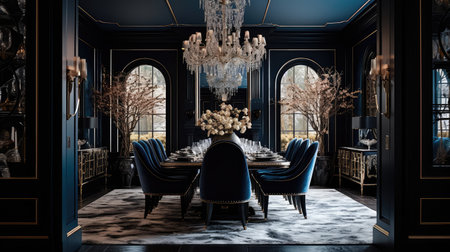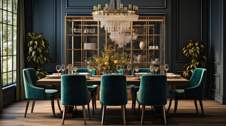 Interior design inspiration of Art Deco Glam style home dining room loveliness decorated with Glass and Velvet material and Statement Wallpaper .Generative AI home interior design .