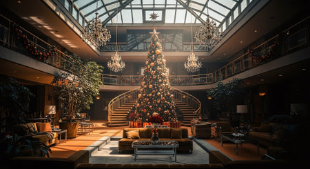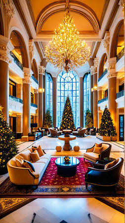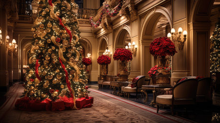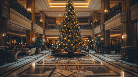 A breathtaking view of a luxurious lobby adorned with a magnificent Christmas tree, twinkling lights, and elegant ornaments, creating a warm festive ambiance.