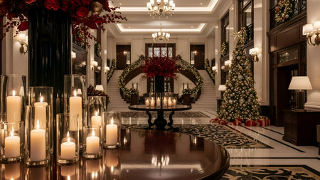 Elegant hotel interior glowing with Christmas accents and dreamy festive ambience.