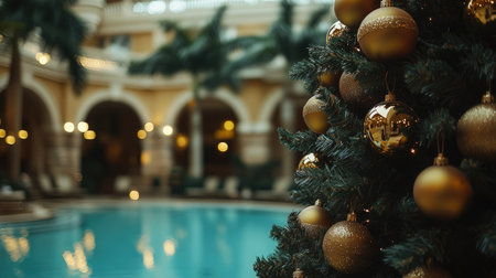A beautifully decorated Christmas tree adorned with gold ornaments stands elegantly by a luxurious indoor pool, creating a serene holiday atmosphere perfect for celebrations.