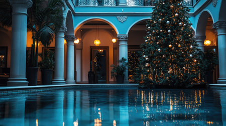 A tranquil indoor scene featuring a beautifully decorated Christmas tree reflecting in a serene pool, surrounded by elegant architecture and festive decor.