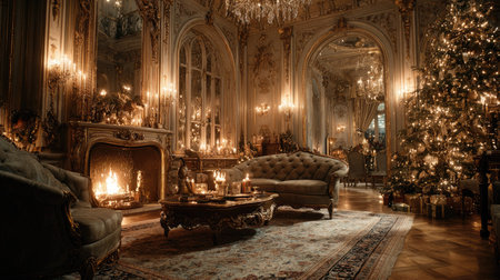 Luxurious living room with holiday decorations and a fireplace for the Christmas season. Concepts of festive home decor, holiday warmth, Christmas celebration.
