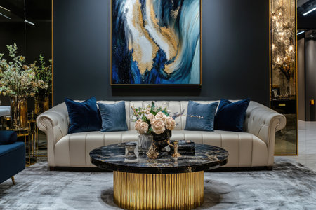 Luxury home decor featuring high-end designer furniture, gold accents, plush fabrics, and modern art pieces