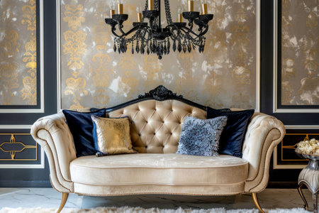 Royal sofa with pillows and chandelier in luxurious interior with ornament wallpapers.