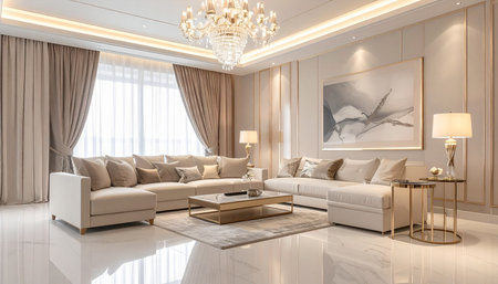 A luxurious minimalist living room with a marble coffee table, elegant neutral-toned furniture, and modern lighting.