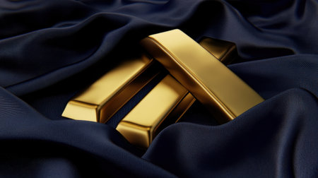 A stunning arrangement of shiny gold bars and ingots resting on a rich silk fabric, symbolizing wealth, luxury, and investment opportunities in a sophisticated manner.