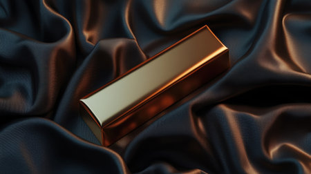 A metallic rectangular object rests gracefully on rich satin fabric, creating a stunning contrast. The smooth surface and elegant drapery exude luxury and sophistication.