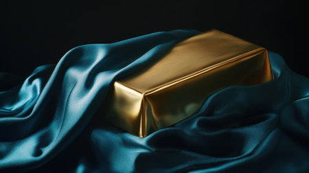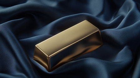 A stunning gold bar elegantly placed on luxurious satin fabric, representing wealth and prosperity. The dark background enhances the richness of the gold.