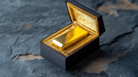 A stunning gold bar presented in an elegant black box with a luxurious golden interior, resting on a textured stone surface for a sophisticated look.