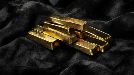 This image features gleaming gold bars resting on a smooth dark fabric, creating a striking contrast that symbolizes wealth and luxury.