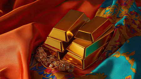 This stunning close-up features gold bars arranged beautifully on luxurious silk fabric adorned with vibrant colors and intricate patterns, complemented by decorative jewelry accents.