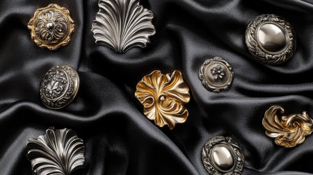 A beautifully arranged collection of decorative buttons featuring various designs and metallic finishes on a luxurious dark fabric surface.