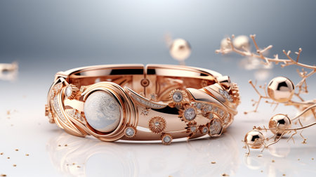 A close-up of elegant gold jewelry captured with dramatic lighting and rich reflections, creating a luxurious feel.