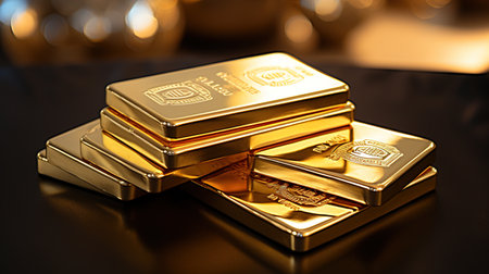 A pile of gold bars, stacked high on a reflective surface, representing economic power, stability, and prosperity in a luxurious setting.