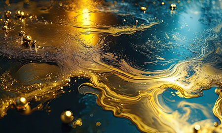 Abstract water surface with gold paint splashes. 3d render illustration