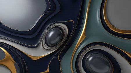 Abstract waves of smooth, glossy gold, dark blue, and cream metallic colors