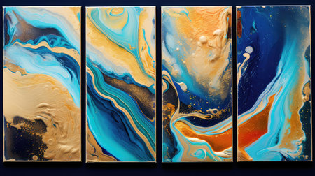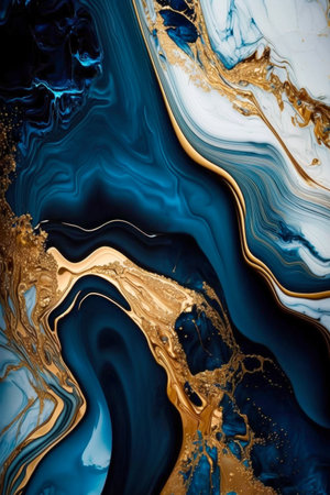 fluid art acrylic paints. Abstract mixing blue paint waves. Liquid golden splashes. Marble effect background or texture
