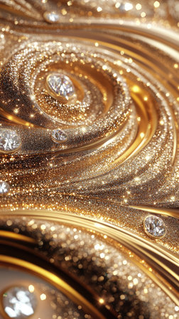 Luxury golden wavy background design with gems. Texture with smooth flowing patterns and light shiny effect.