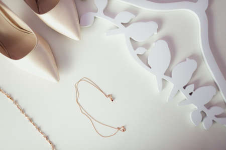 Close up Elegant light beige wedding varnish shoes with sharp noses, pillow for rings, earrings, perfume and garter for the bride on a white gloss windowsill background. Wedding wear, accessories.
