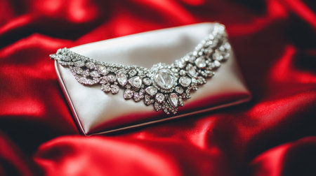This stunning clutch purse, embellished with intricate rhinestones, rests gracefully on rich red satin, capturing elegance and luxury for any special occasion.