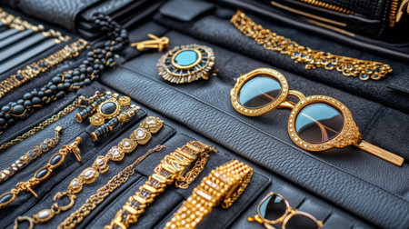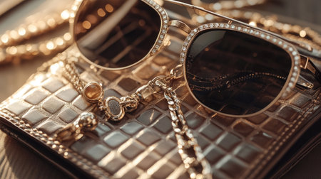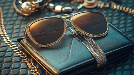 A stunning arrangement of luxurious accessories featuring stylish sunglasses on an elegant wallet, accompanied by beautiful jewelry, perfect for fashion lovers.