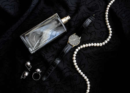 Black background with a bottle of fragrant female perfume and pearl decoration